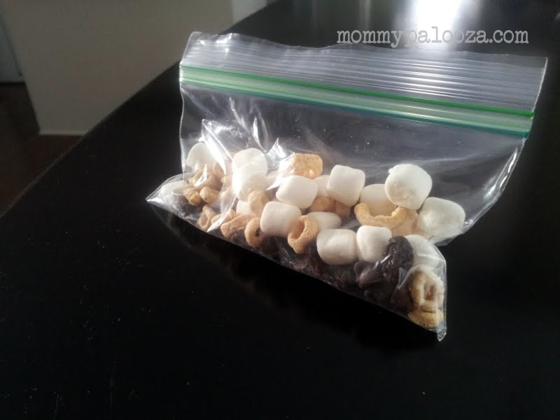 It’s 100 pieces consisting of 20 Honey Nut Cheerios, 20 raisins, 20 Alpha-Bits cereal letters, 20 mini chocolate chips, and 20 marshmallows. They were pretty excited and wanted to have it for breakfast. Um, no!