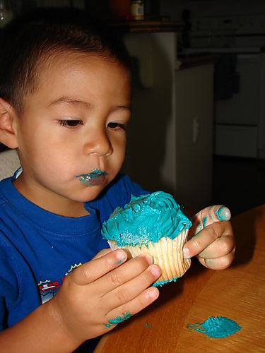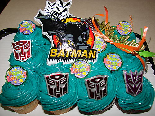 We celebrated D’s birthday today so you know what that meant.  CUPCAKES!  We set out to find cupcakes this morning since N had a very clear picture of what kind of cupcakes he wanted for his Dad.  He clearly described them as needing to be Incredible Hulk and other superhero themed cupcakes.  We didn’t exactly find what he had in mind but we were able to get some extra accessories from the lovely ladies at the Wal-Mart bakery and eventually ended up with these custom treats:
