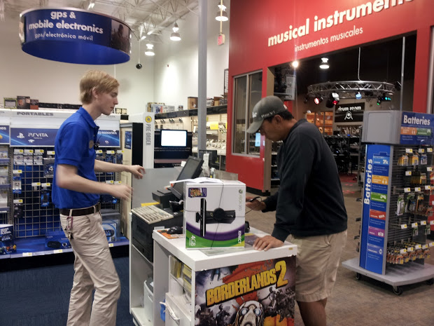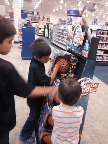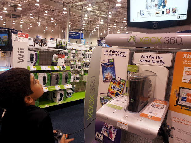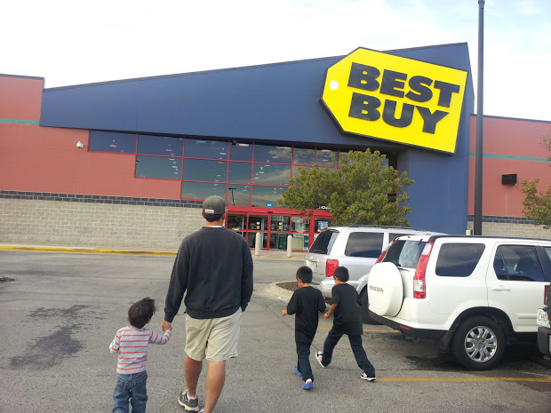Recently I headed out with mi familia to our local Best Buy store to pick up our new XBOX 360 Kinect.  Can you TELL how excited my two older boys are?? Look at those gigantic steps they're taking toward the store!  Once we were inside, it was like letting dogs loose in a park.