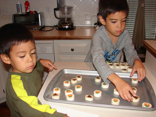 I love to bake.  That's no secret.  But, I also like hassle-free food and fun when it comes to getting the kids involved.  The other day while grocery shopping, I noticed that the Pillsbury Halloween themed cookies were on sale.   You know, the kind that you just break off then put on the cookie sheet and ten minutes later bake up into deliciously decorated cookies?  So, I decided to get a box but W was with me and he kept going back and forth between the black cats and the pumpkins.  I decided to just get both – what the heck!