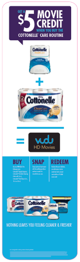 Right now, if you head into Walmart and purchase both the Cottonelle Clean Care toilet paper and moist Cleansing Cloths, you'll get a $5 Vudu credit. Vudu is the ultimate HD movie streaming experience and offers HD movies that you and your family will love. You can redeem this offer in just 3 easy steps: