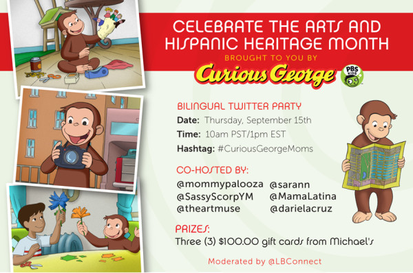 I'm SO excited {and honored} to share that I'll be co-hosting a Curious George  bilingual Twitter party in celebration of the Arts & Latino Culture!