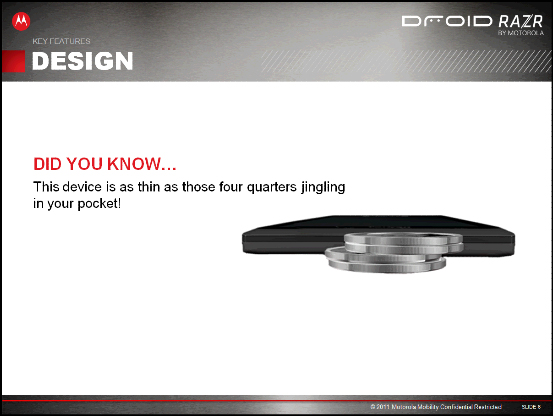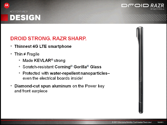 The new Droid RAZR brings you durability that only comes from Motorola.  It's made with Kevlarยฎ fiber, a material that is 5 times stronger than steel!  Yes, for those of you who are busy moms like me that means no more broken phone when your toddler suddenly drops it from the grocery cart or begins banging it on the floor during playgroup.  I just dare your little dude or dudette to make a dent in this phone!