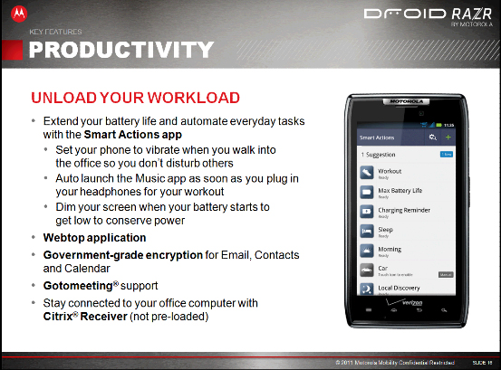 Another great feature that moms can appreciate is the capability to set "Smart Actions" with this phone.  What does this mean?  In short it will enable you to set various actions based on environments or threshholds that you preset on your phone.  For example, let's say you volunteer up at the kids' school computer lab every Monday morning (like I do) and want your phone to be set to "vibrate" or "silent mode" automatically.  This can be set up on the new Motorola Droid RAZR via the Smart Actions app which can tell your phone to turn off once you reach a particular location (detected via GPS).  Another example of a trigger that can be set is let's say you receive a missed call from a specific number, your phone can automatically send you an email alerting you so that you don't forget to return the call!  Seriously — genius!