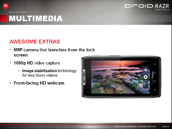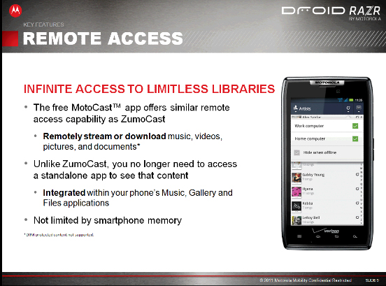 And talk about smart!  One of the coolest features I love about my Droid Bionic is the ZumoCast app which allows me to access all of my laptop photos, videos, and documents remotely on my phone.  SO cool!!  Well, the Motorola Droid RAZR is taking it even one step further.  With the new MotoCastโ„ข app, you can access all of those remote documents on any other connected device seamlessly.  Yep, that's right. What this means is that you have access to all of those files on your computer and don't have to go through a standalone app to access them either. Sa-weeet!