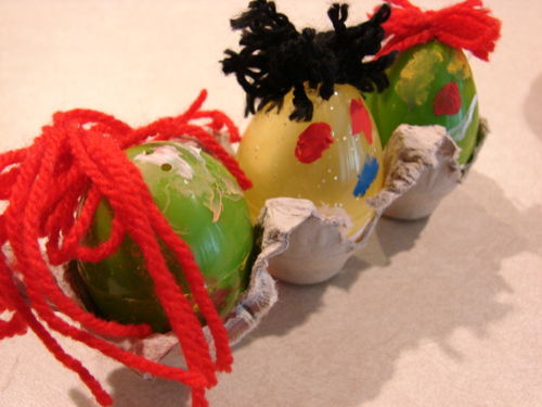 A couple of weeks ago we picked up a very cool {and very old} kids craft book at the library after N saw it referenced during an episode of Reading Rainbow.  Since then he's asked incessantly to make something from the book.  So this week I indulged him.  There was this one project in the book that he was just dying to make – egg faces.  I told him it was more of an Easter craft but he still wanted to do it.  Fine, I decided, but we were not going to use real eggs – too wasteful.  So I went digging around in the basement through our Easter decor bin and found our plastic eggs from last year {I also found the ones still in their packages I bought on clearance after Easter at PBK, but there was NO WAY I was going to use those!}.