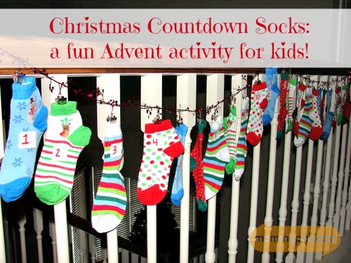 This morning the kids woke up to find their Christmas Countdown Socks hanging outside their bedroom in our hallway. I usually do some sort of Advent and month countdown activity with them in December, but this year I decided to change it up a bit. It was so economical, too! I spent about $20 on the whole project!