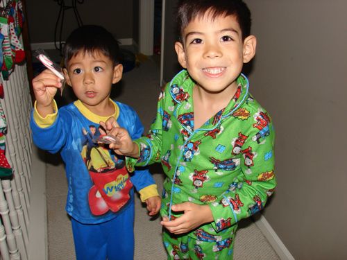 I bought twelve pairs of socks from Target's Dollar Spot section (a combo of both kids and adult socks), two packages of festive holiday ornament clips, and a container of red wired garland. Then I took some old inkjet address labels I had and cut each label in half to make 24 squares and hand wrote each day's number and stuck it on a sock. Voila! Everyday from now until Christmas Eve, the kids will find a fun little surprise in their Countdown to Christmas Socks! Today it was a mini fruit-flavored candy cane. And after eating a full breakfast of eggs and raisin toast, they got to enjoy their treat!