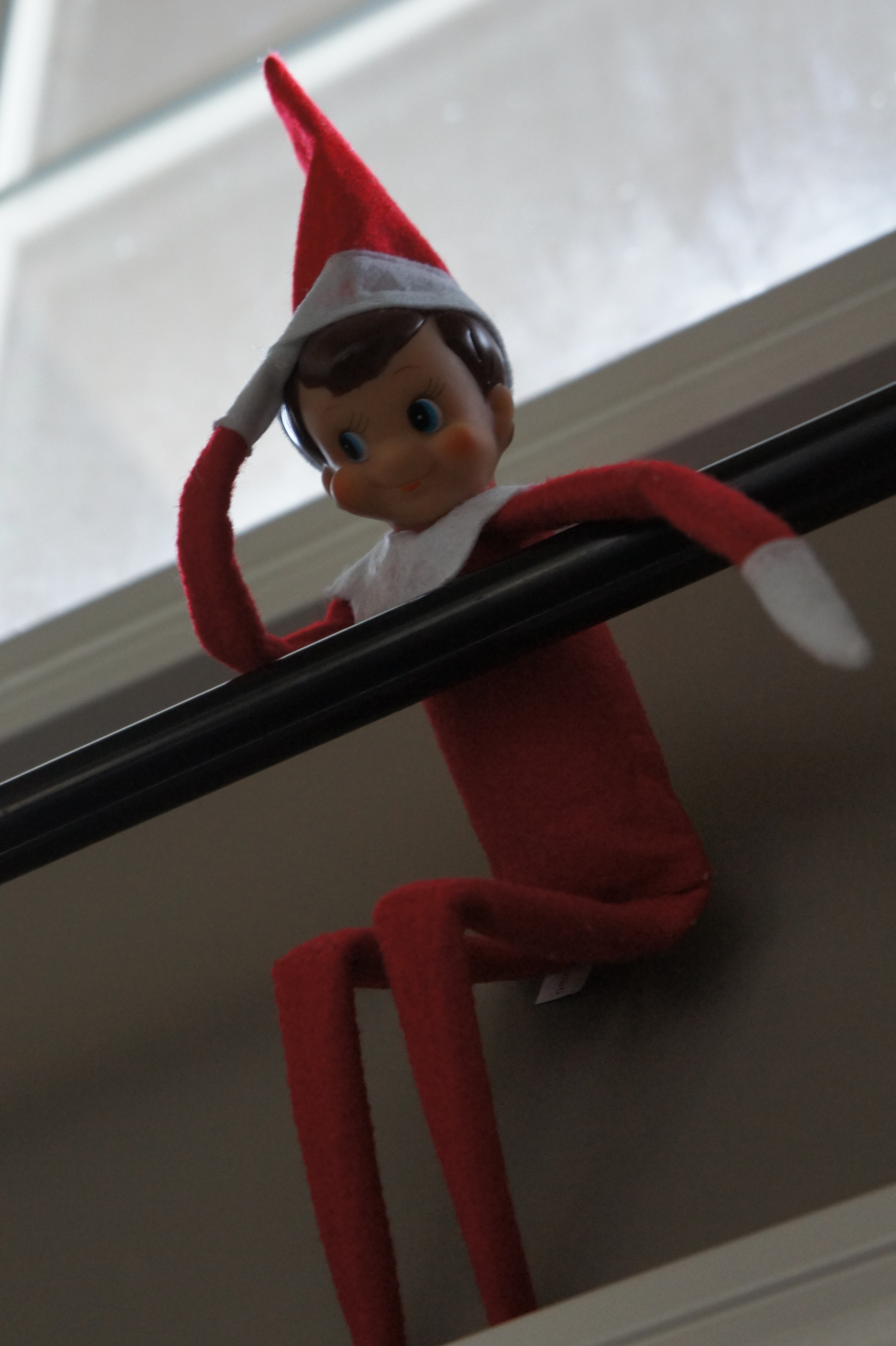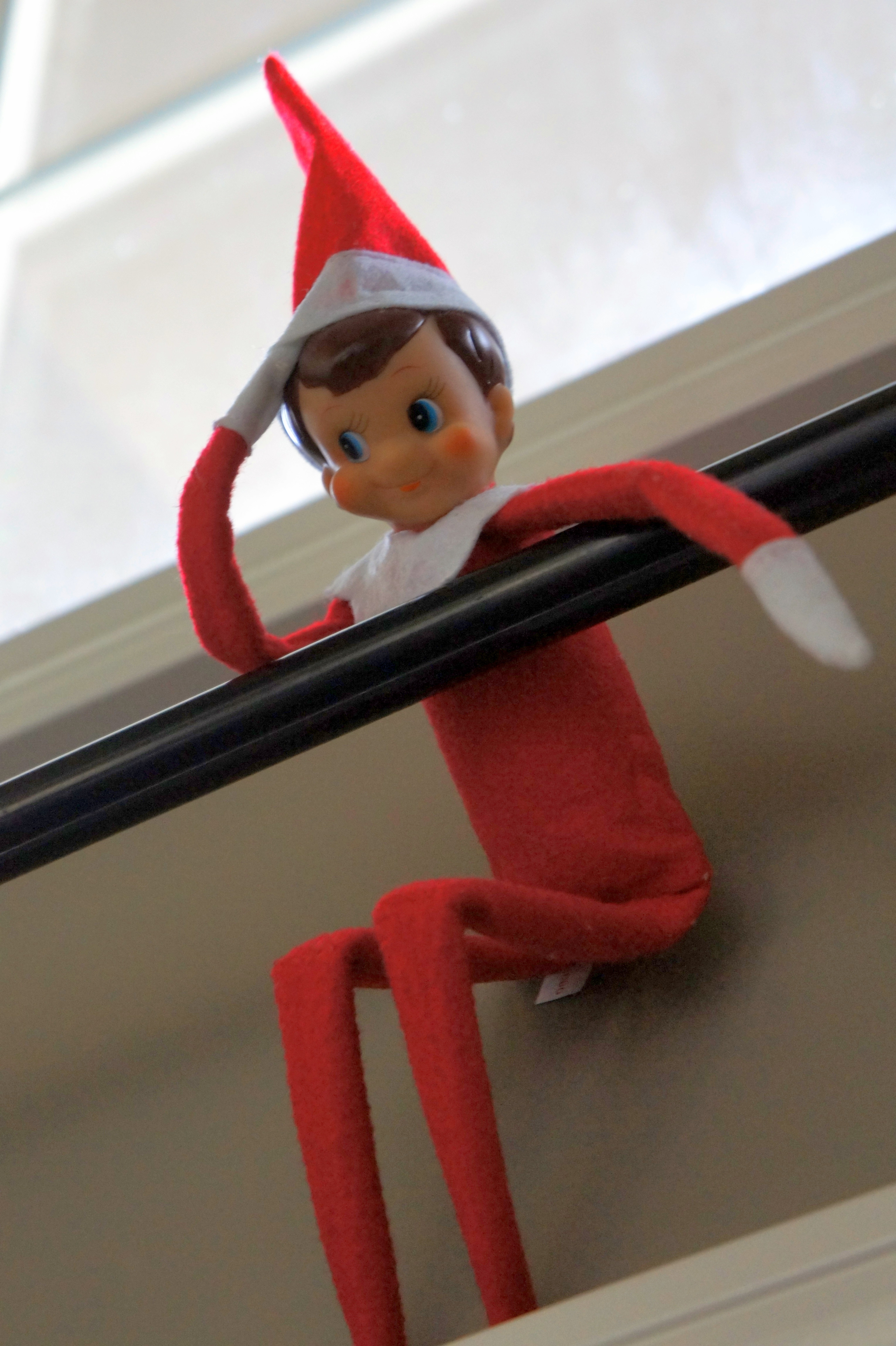 Egbert Nelf the elf is back! The kids awoke yesterday morning and found him here, above the front door with a salute of some sort. This morning, we found him hunched over the back of the fish tank and there were little scraps of fish food all around. Apparently, he’d been trying to feed our fish!