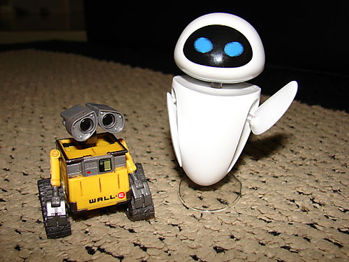 It's the long awaited Wall-E & Eve.  N & W have known these characters by name for months!  The movie finally opens this weekend, but alas, they will be on their Texas vacation by then so we'll have to wait until July to see it in theatres.  D said the toy figurines hadn't even been put into the Blockbuster inventory system when they went to buy them yesterday so they had to wait a while for them to actually put them into their computers before ringing them up.  The boys are so into robots, it's sickening!  From robot dances to robot commands and chores, the T household is full of 'bot tots!