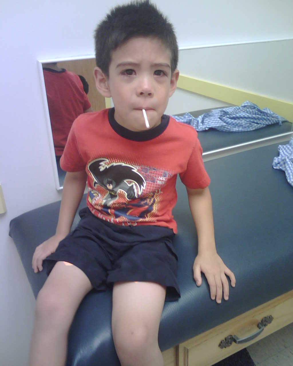 N right after shots with the sucker in his mouth. One of the band-aids is barely peeking out of the right leg of his shorts.