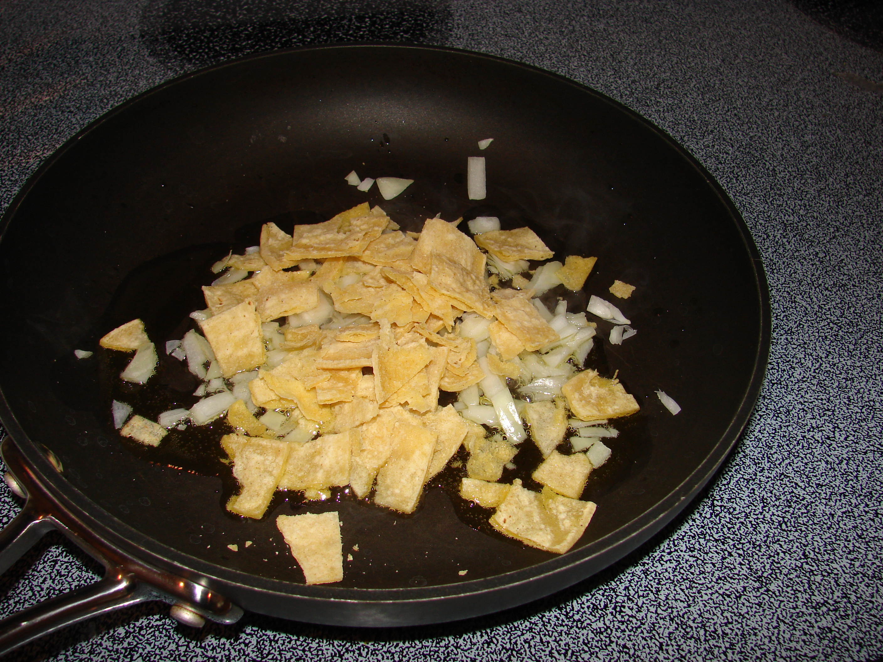 Sauteeing a few onions and corn tortillas.