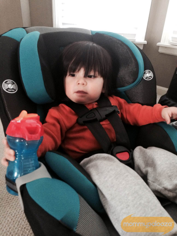 Another small feature that makes a BIG difference is the innovative cupholder design of the Evenflo Platinum Protection Series car seat. The no-fuss elastic straps (on both sides of the car seat) allow for ample room to accomoadate just about any size cup or container to keep the kiddos’ stuff neatly in transport.