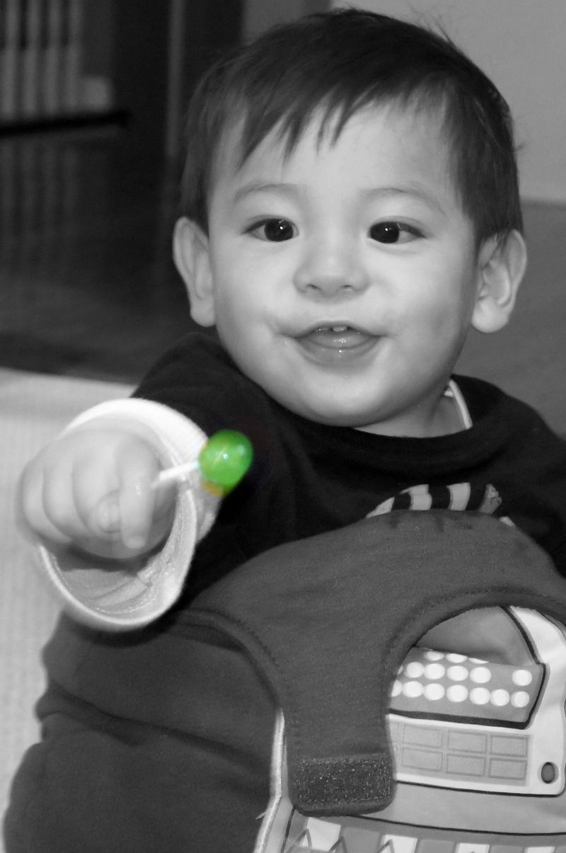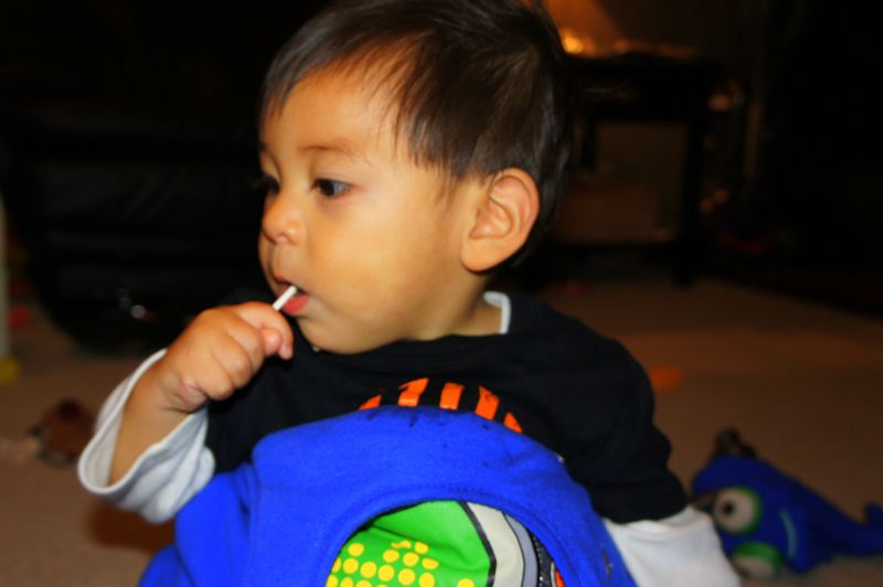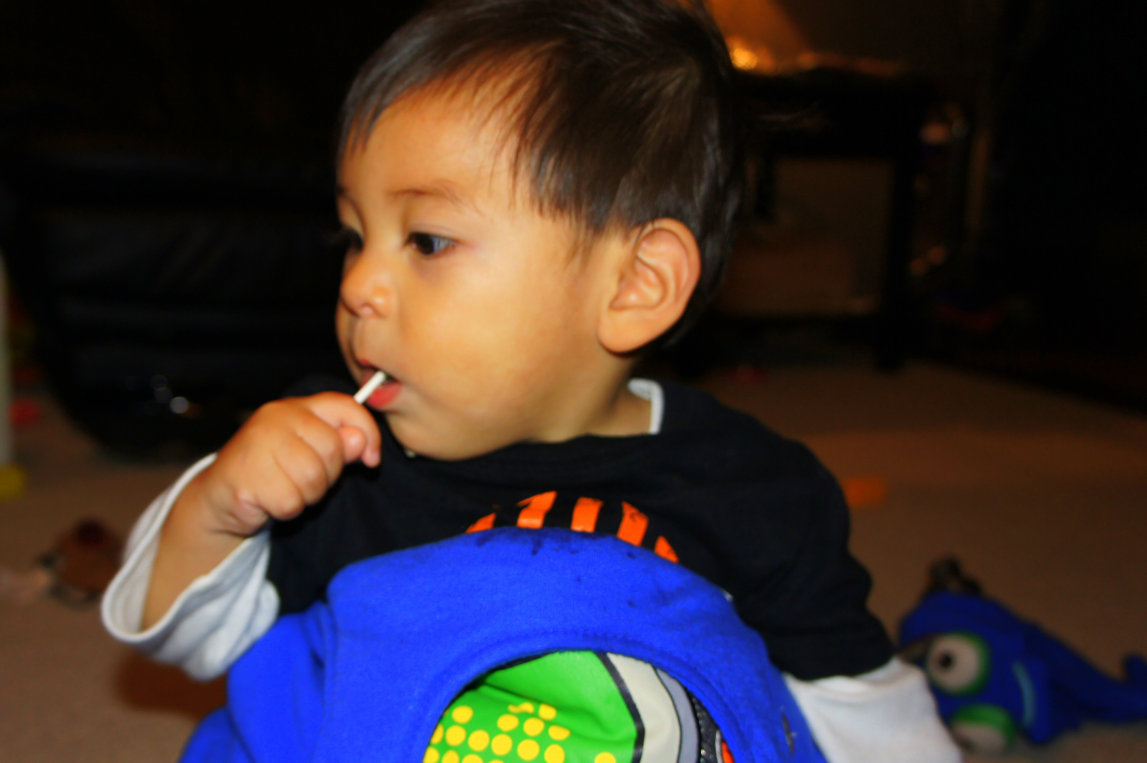 I did, however, capture him with his first taste of candy ever — it was something he chose from the pile of all the candy we had in the middle of the living room floor. His selection? ‘Mystery’ flavored Dum-Dum.