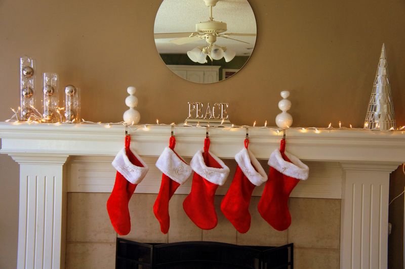 Our mantle. Or mantel. Whatever. I prefer the first spelling. Anyway, it's back! This year I added a strand of white lights and it is a stunner at night! Love having it on in the evenings. Can't wait till we start our fireplace up soon! In case you can't tell, I am a minimalist and prefer a modern feel and look. I didn't buy anything new this year except the one strand of lights ($2.29 at Target). The little faux-filled snowmen on either side of the stockings are from my favorite home store, CB2, and just about everything else is from Target or Michael's – including the stockings and crystal monograms pins on each.