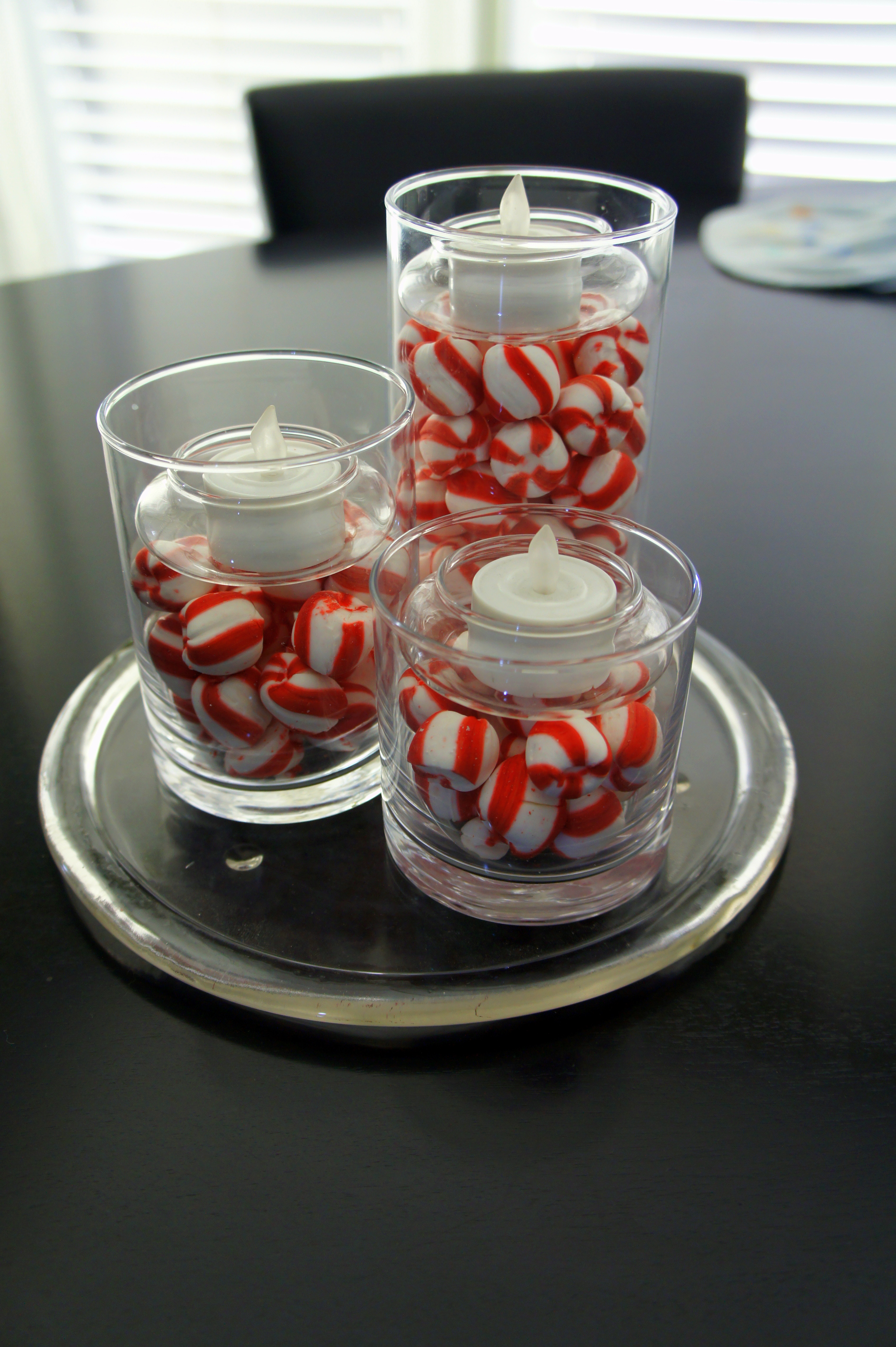 I absolutely LOVE this candle holder trio I bought several years back. It is so versatile and has served me well! Remember my post about using it in my Halloween decor? Well, I simply took out the orange tissue paper and filled the glasses with holiday mints ($2.49/bag at Target) and I really like the way it turned out! And, yes the kids DO want to eat from it, but thankfully I bought them their own bag to eat out of! They know these are off limits!