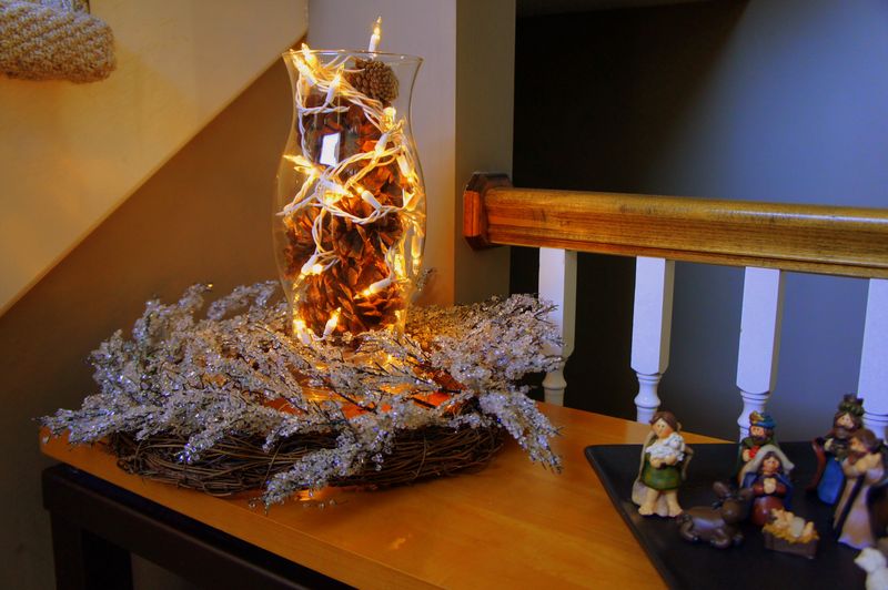This is part of our entryway table decor. I loathe decorating my entryway. I'm not sure why. Maybe it's because we NEVER come into our house from our front door….always the garage. Anyway, I've had this table FUH-orever and it floats from upstairs to downstairs, depending on the time of year. I decided I wanted to display the kids' nativity scene downstairs this year and then next to it I just put one of my hurricane glasses, filled it with pinecones and a strand of lights, then set it in the middle of this wreath that has these ice-like little crystals that I just LOVE! By the way, I am getting a new wreath for my front door this year…just waiting on it to be delievered! It's homemade (not by ME, silly!) and LOVELY! I can't wait to share it with you! So, I am loving how this table looks, especially at night….so bright and festive! Plus our stair banister has lit garland throughout too so it's really a "lit-up" entryway at night!
