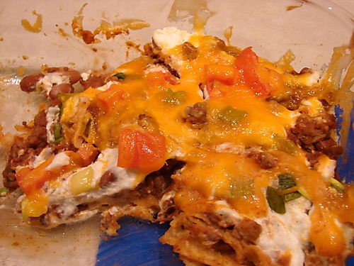 • I left the tortilla chips whole instead of crushing them which gave the casserole a very nacho-like quality.