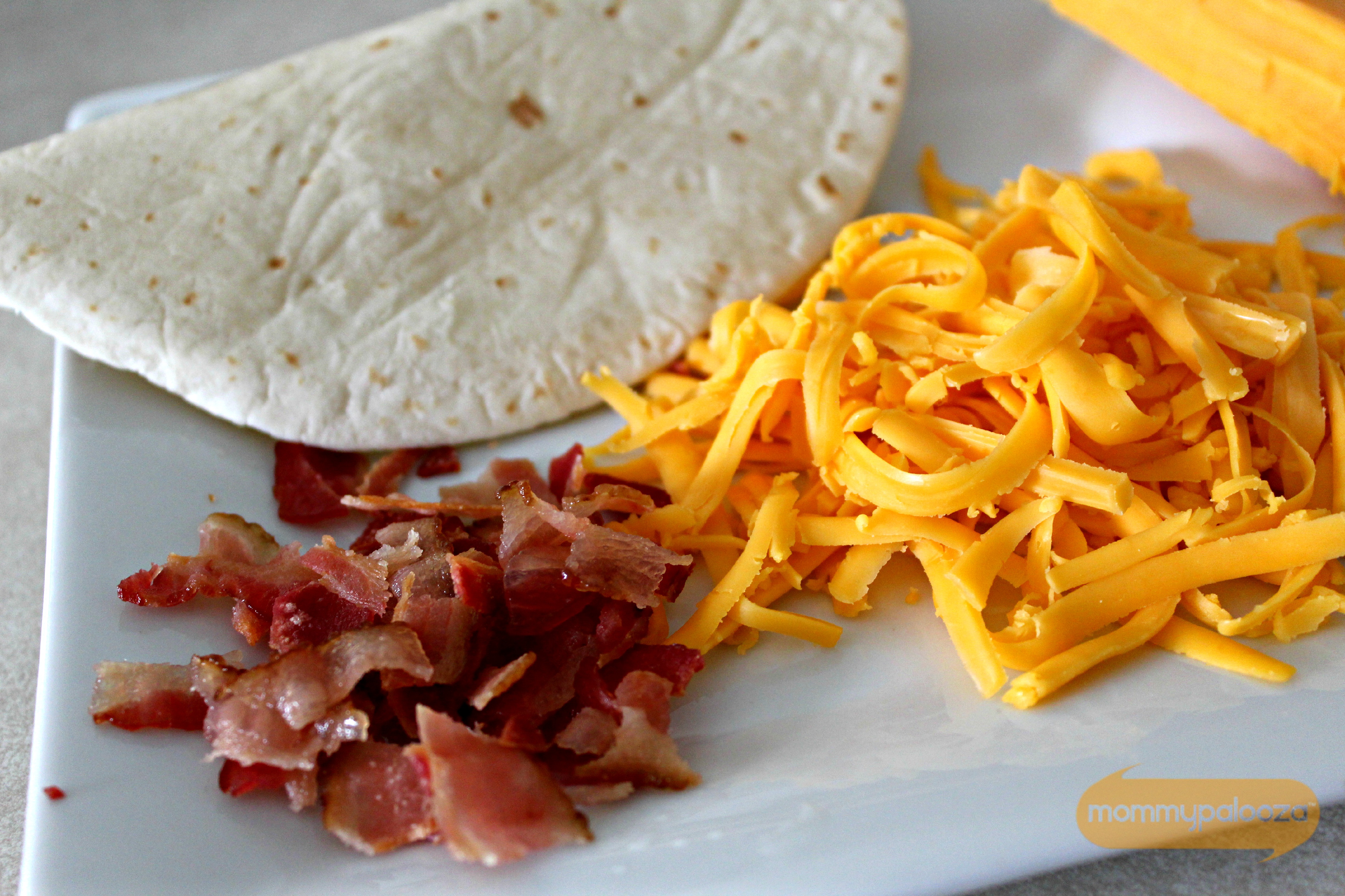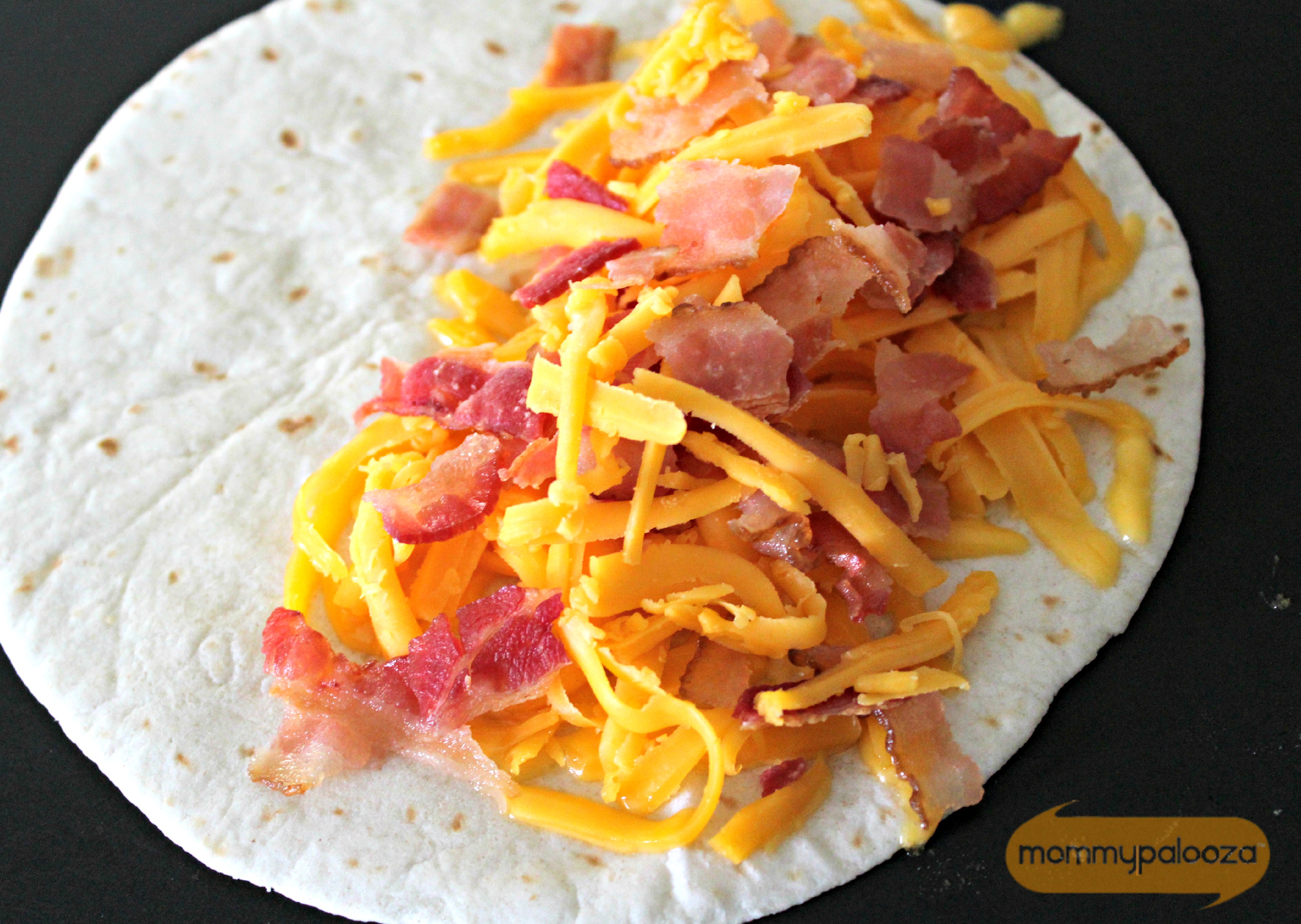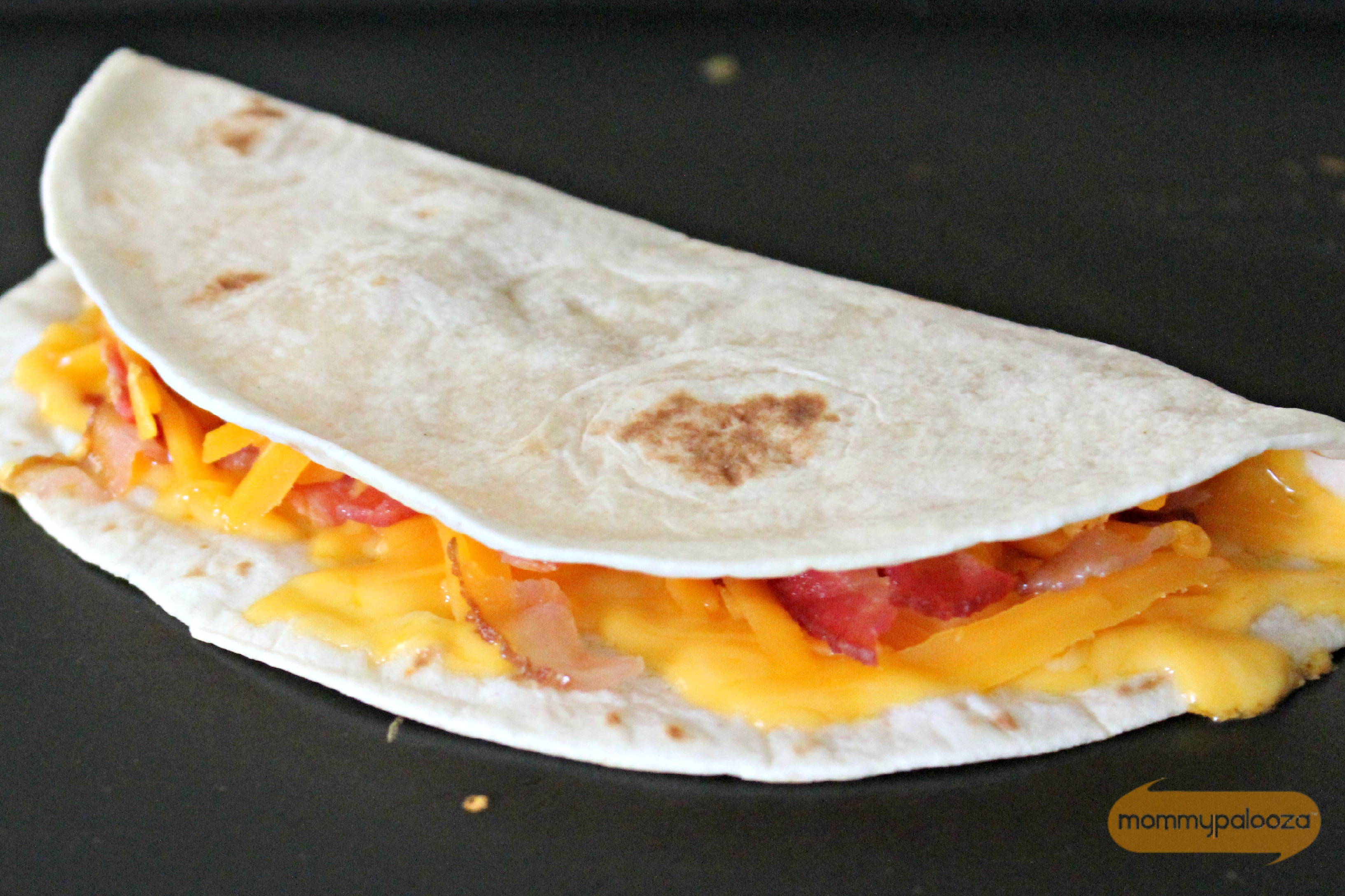 Now for the fun part! Preheat your griddle or skillet to about 300 – 325 degrees and let the tortilla warm up just a little bit on one side. Then, I like to flip it so that the warmest side is facing up. I then top it with the Farmland® Bacon crumbles and the shredded cheddar cheese. Because I’m placing it on the warm side of the tortilla, it tends to melt a little quicker and easier. Then, just flip up the other side of the tortilla on top of the bacon and cheddar filling you just added and let it continue to melt. After about 20-30 seconds, you can flip the entire tortilla over to toast a little bit on the other side and continue melting.