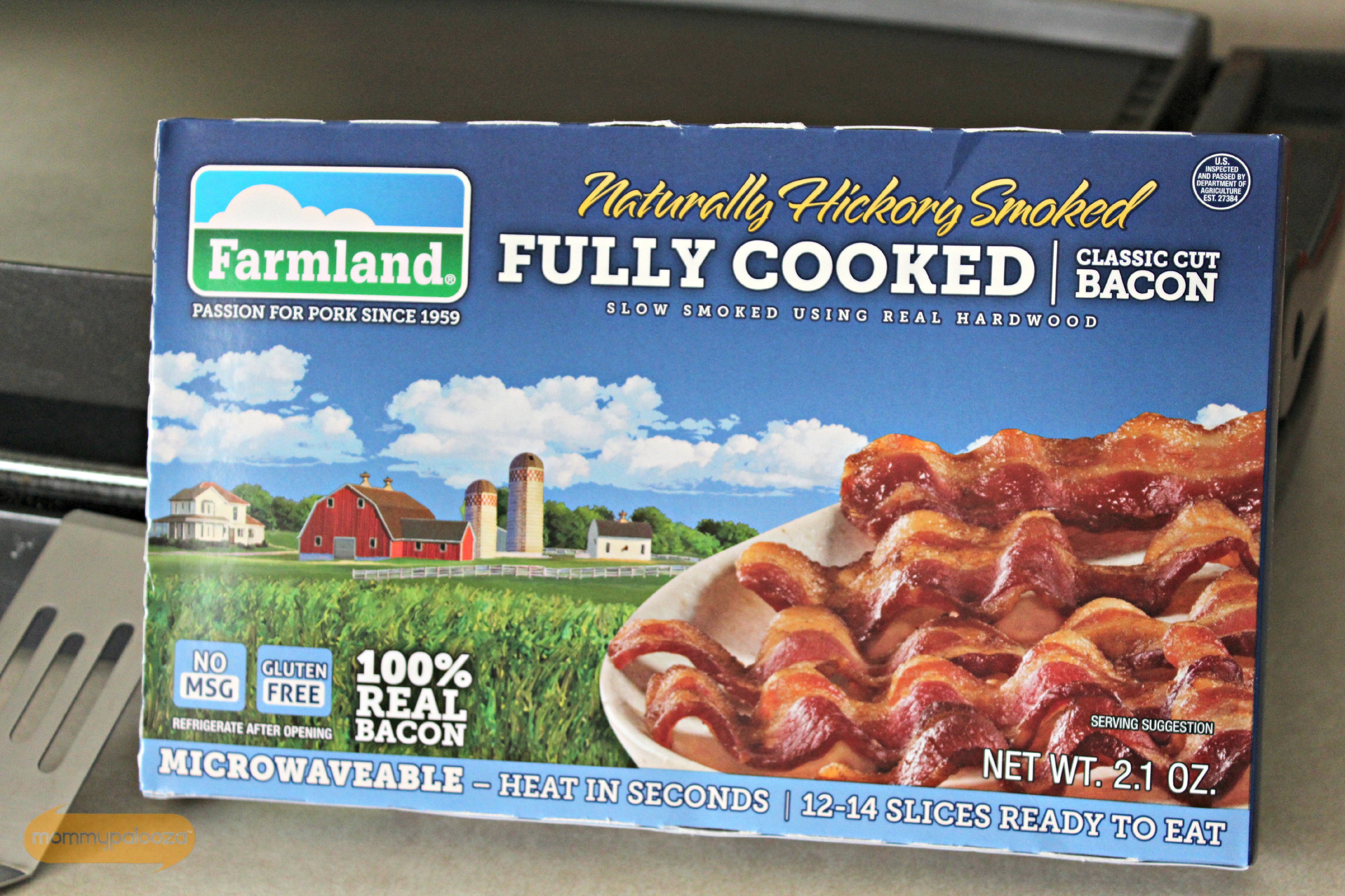 I started off with the Farmland® classic cut fully cooked bacon because when you’re hosting a crowd for a game day get together, it’s nice to have some time savers in the kitchen. But what’s even better is that even though your prep time may be cut, the flavor in these delicious strips of bacon, is not! So tasty after just a few seconds in the microwave!