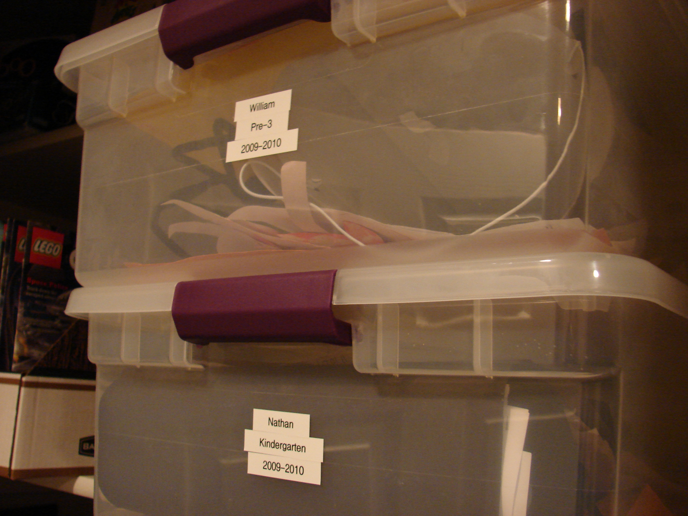 These are a glimpse into our bookshelves that house the boxes I use to save and store ALL of the kids' papers and projects they've EVER brought home. Nathan has 4 boxes – one from 3 year old preschool, 4 year old preschool, Pre-K and now his Kindergarten box. I think he will need at least two boxes for Kinder. This is Will's first box. I just can't bring myself to throw any of their creations away – even a scribbly paper!