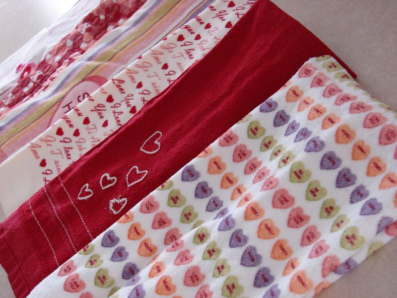 I own at least a dozen Valentine themed dishtowels, dishrags, and the like. I am sharing with you a few of my favorite. I love being able to wake up each day and start with a new one! They're so festive and bright and who doesn't love pink and red hearts everywhere??! ♥