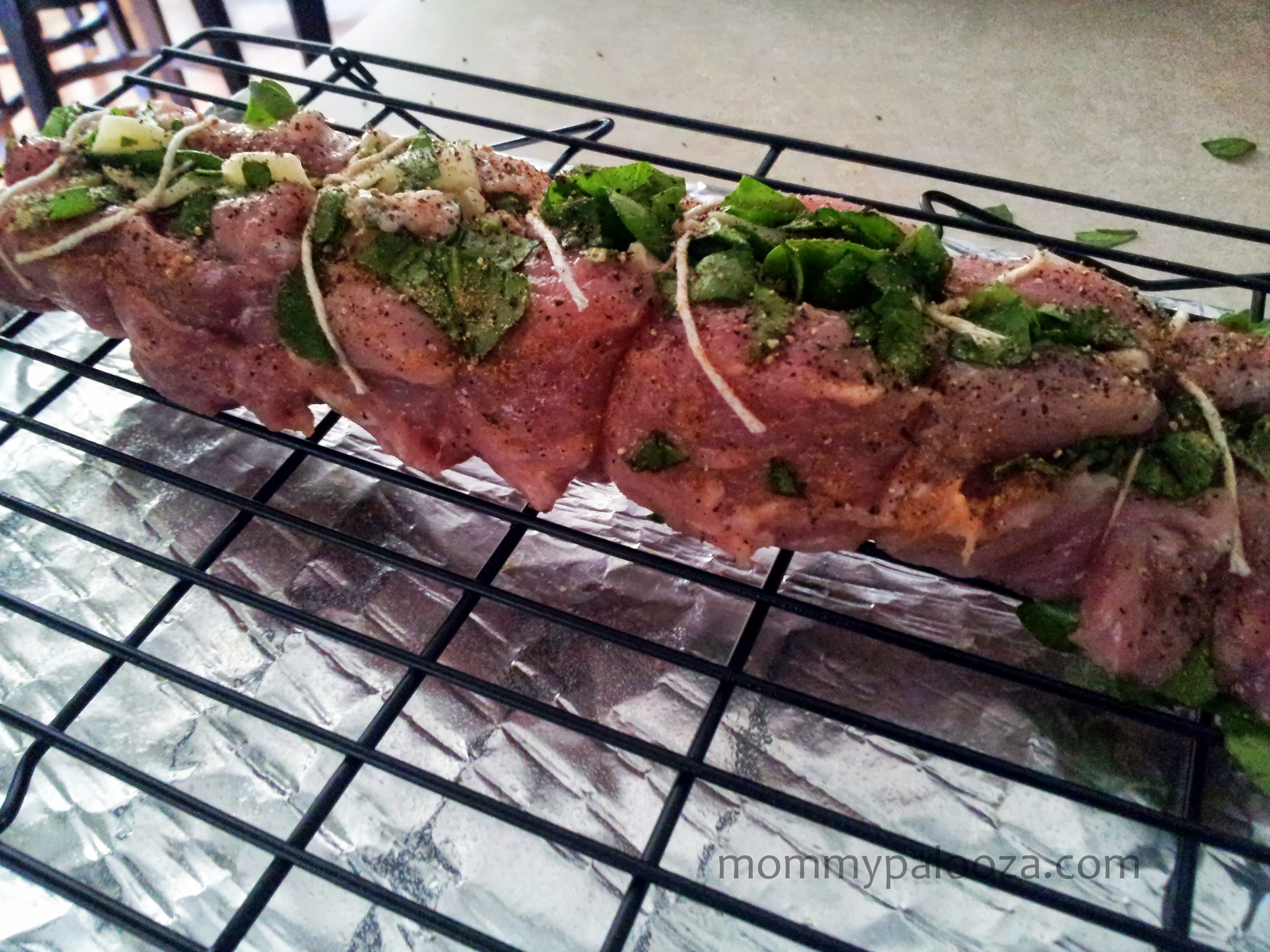 - Carefully roll it up, starting with a long side. Using kitchen string, tie the tenderloin going down its length about every 1 to 2 inches. Sprinkle the tenderloin with remaining spices, then place it on a rack in a shallow baking pan. {I simply used a foil lined baking sheet and placed a cooling rack on top of that and it worked fine.}