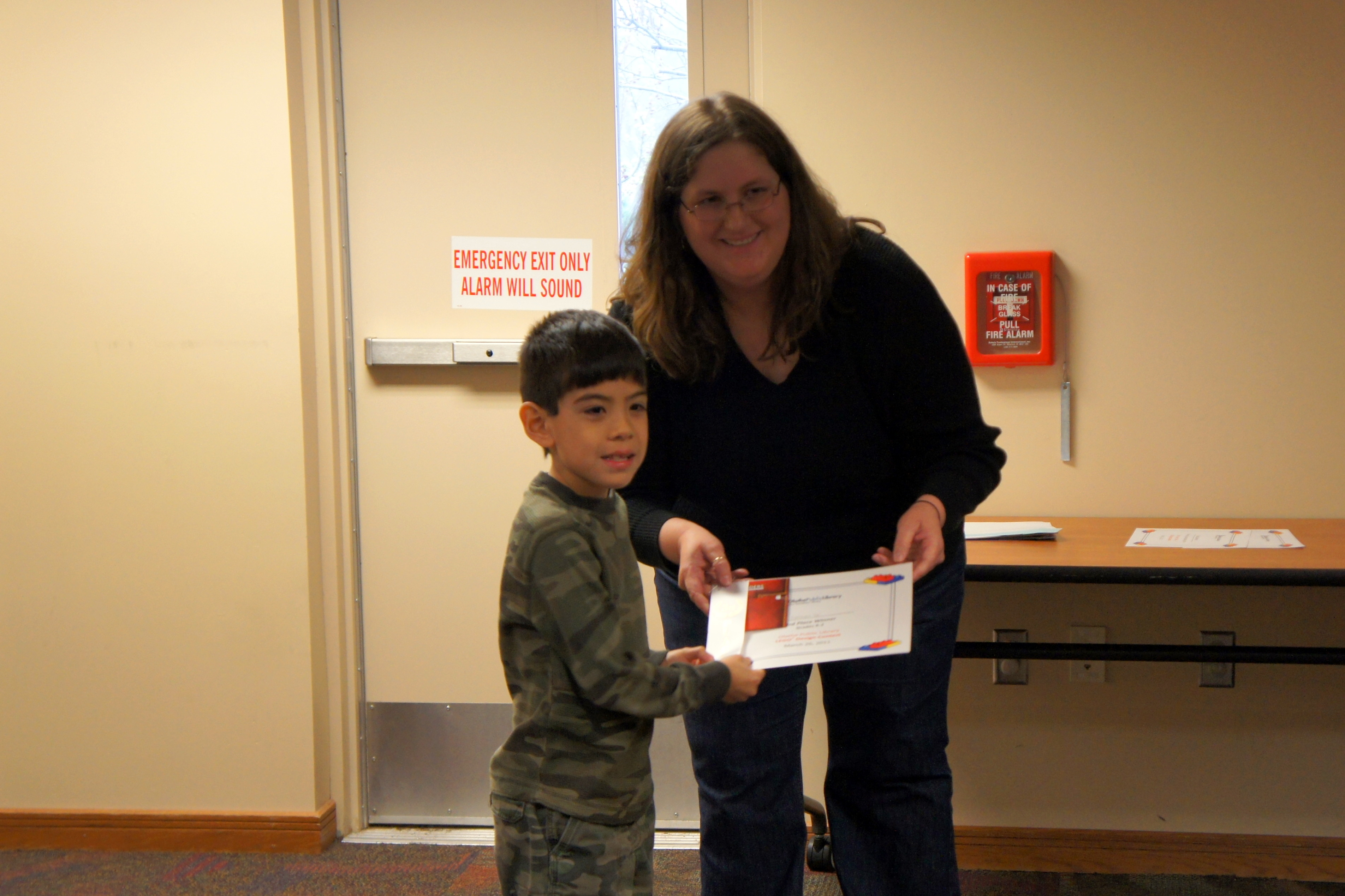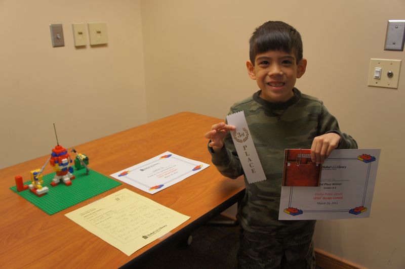 Oh my goodness, I was so proud to share in this moment with him! To say that he ADORES Legos and Lego-building is such an understatement! So he cheerfully walked up to receive his award while the entire room applauded. A white 3rd place ribbon, a Borders Bookstore gift card, and a keepsake award certificate — he was excited and proud!
