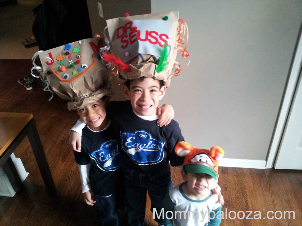 The kids' school is celebrating Dr. Seuss this week by having the kids wear wacky and fun hats & socks on Friday. After going through our dress up bins down in our playroom to see what they could come up with, my oldest suggested making them out of a paper grocery bag, as we've done in previous years at the arts & crafts tent at our favorite family festival.