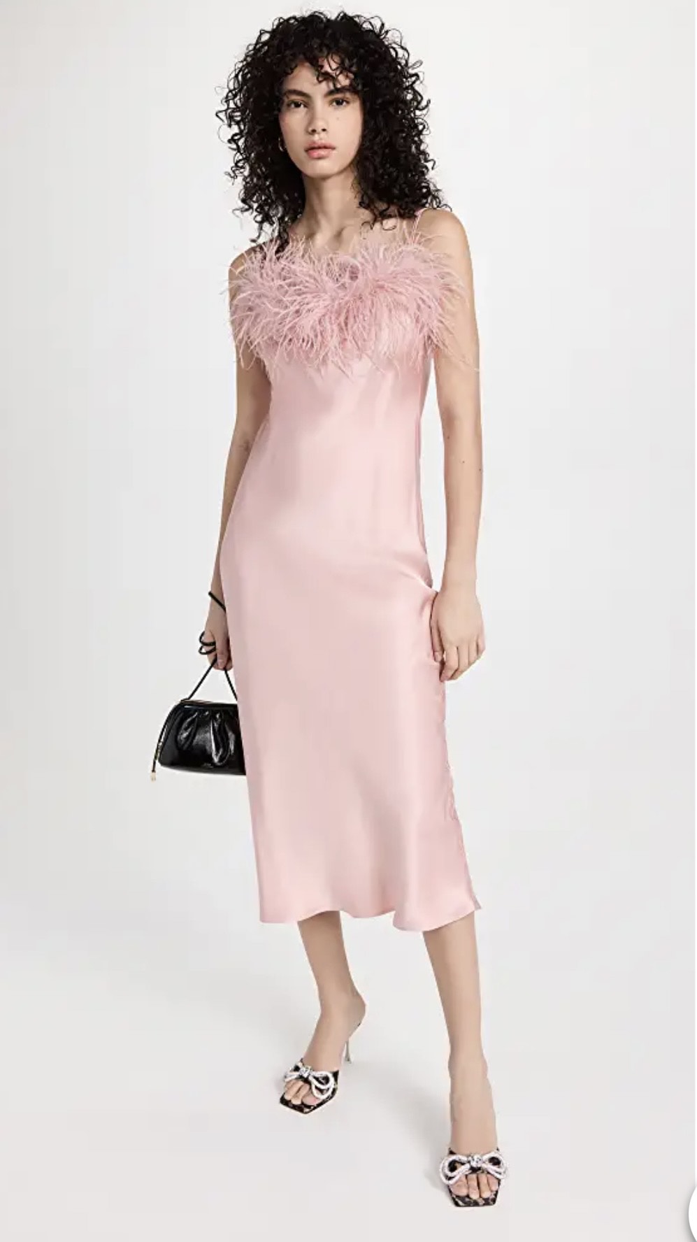 This soft pink slip dress with the feather details would be perfect for a spring or summer wedding. If the wedding is in the cooler months, try wearing deep jewel tones like reds, purples, and greens. Image courtesy of Shopbop.